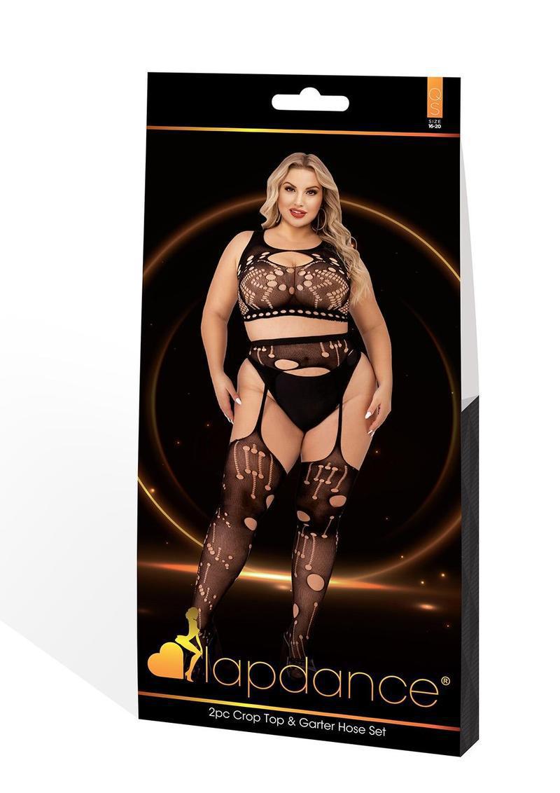 The Lapdance Lingerie two-piece crop top and garter hose set is a strikingly seductive ensemble that combines bold design with a touch of elegance. Made from a stretchy and comfortable blend of nylon and spandex, this black set features varying-sized patterned cutouts throughout, creating an alluring peek-a-boo effect. The crop top enhances the bust while offering a flattering fit, and the attached garter hose seamlessly elongates the legs for a captivating look. This set is designed for those who want to exude confidence and sensuality with every detail.