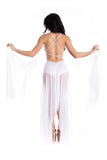 Frolicking through the sunlight, our sexy Day Fairy entrances all who find her in her white mesh romper with a laser-cut design, allover rhinestone embellishments, high cut leg, and open back with criss-cross straps. Her matching lycra boyshorts with cheeky cut mask the thong cut back of her romper, and the attached, draping mesh pieces complete her angelic and magical essence.