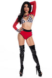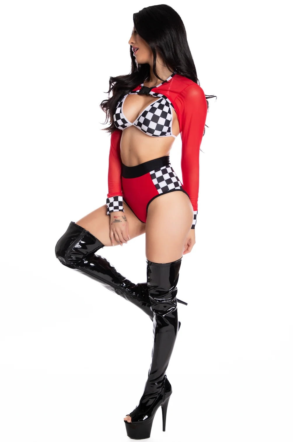 You ready to ride? Ready, Set, Go is super hot and yearning for first place in her sexy checkered tri-top with halter straps and a tie back closure, and a sheer red mesh shrug with a buckled neckline, long sleeves and checkered cuffs. And her matching high waisted panty with a cheeky cut has everyone on her tail, the way she likes it.