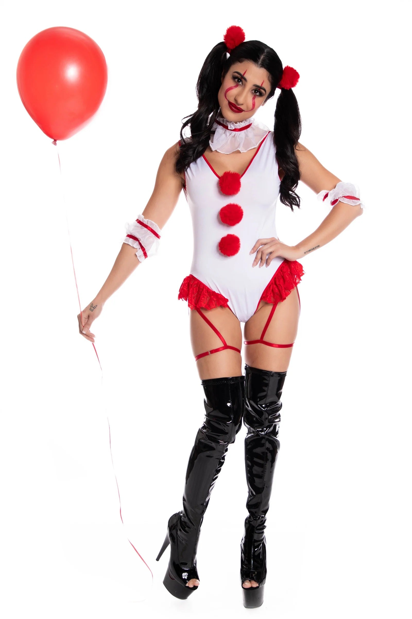 We all float down here. Our Demented costume is always tempting others into chaos with her white bodysuit with a red-trimmed V-neckline, red marabou buttons, and deep scoop back. She draws them in with her high cut leg, ruffled lace trim, and cheeky cut back, and the red garter straps with wraparound leg garters make her charms irresistible. Her scarily sexy look is complete with matching arm cuffs, a large matching collar, and red marabou puff hair ties.