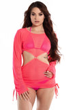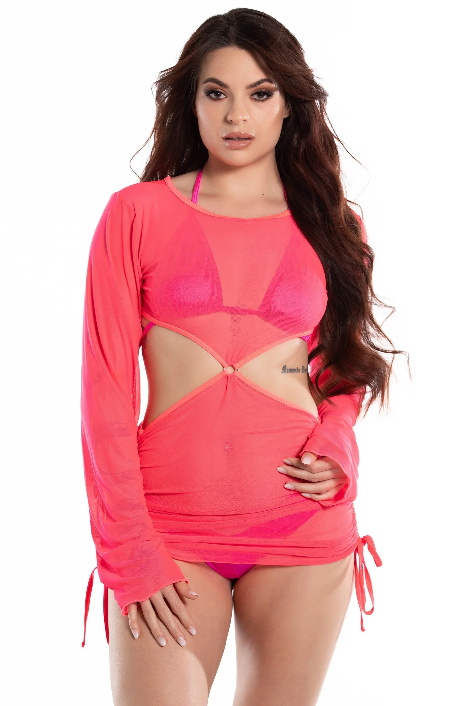 Long sleeve mesh dress. Designed with a high neckline, a sheer mesh bodice with cut-out panels, a silver O-ring, long sleeves, and adjustable side tie closures. *Dress only.
