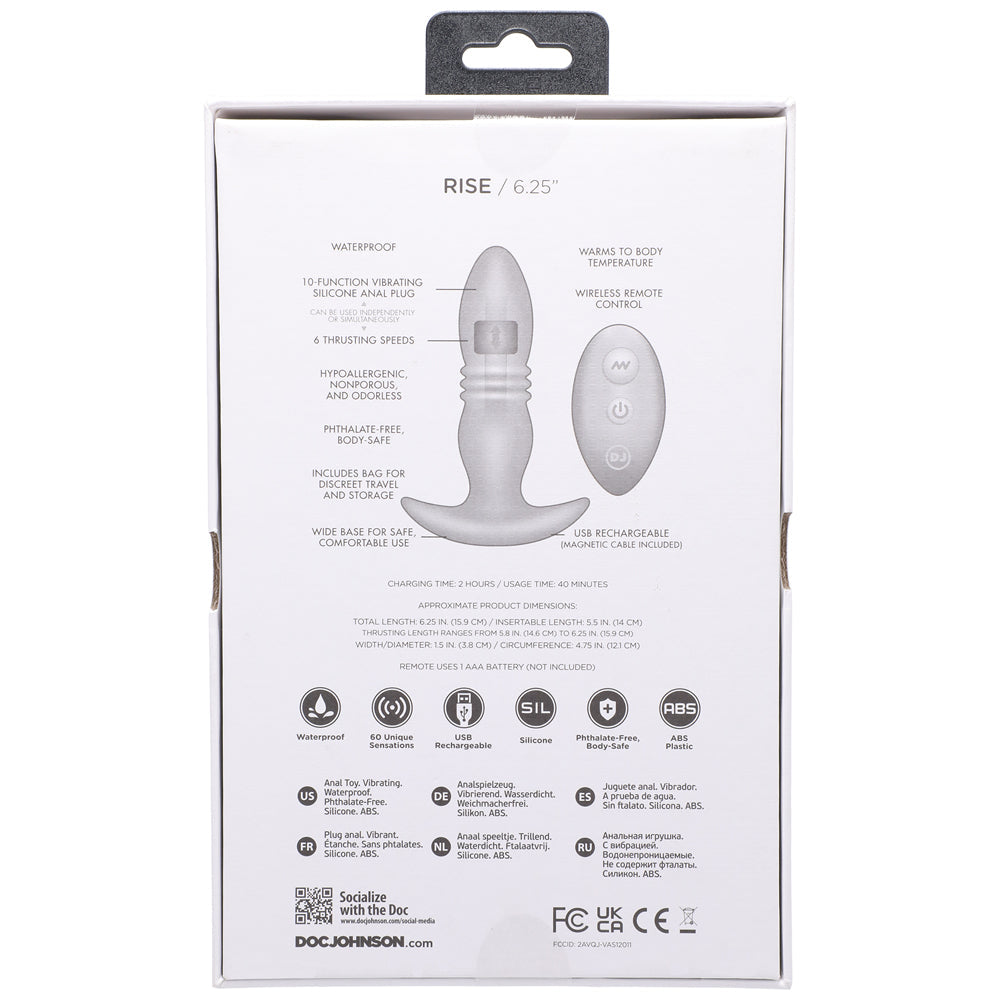 The A-Play RISE is a premium quality vibrating and thrusting anal plug, conveniently controlled directly on the product or via the included wireless remote. A-Play is Doc Johnsons high-end line of performance anal plugs, created with a variety of sizes and special features to promote anal pleasure and exploration for users of every experience level. Each product in the A-Play collection is USB rechargeable, waterproof, and includes a charging cable and fabric storage bag.