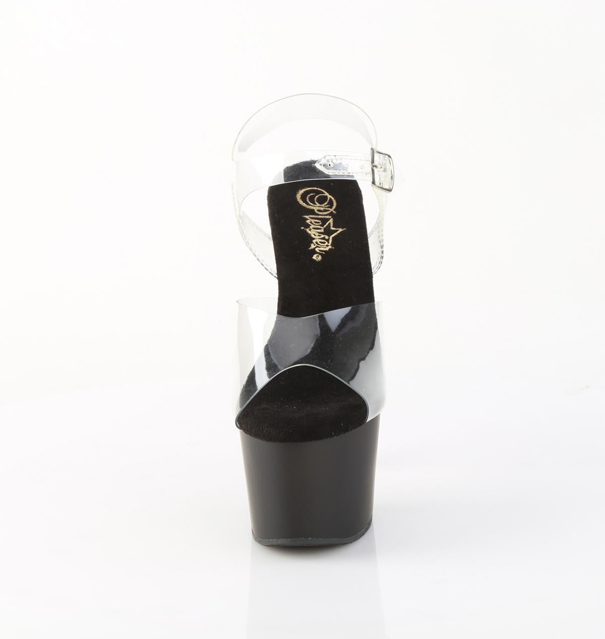 The Adore-708 Sandals are a masterpiece of modern footwear, designed for those who dare to stand out. With a 7" heel and a 2 3/4" platform, these sandals offer a bold silhouette that commands attention. The clear straps and black matte platform combine for a chic, futuristic aesthetic that complements any outfit. Perfect for adding a dash of drama to your wardrobe, these sandals are ideal for nights out, performances, or simply embracing your unique style. Step into the Adore-708 and let your confidence shine.