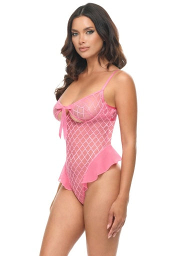 UNLINED UNDERWIRE FLOCKED DIAMOND MESH OPEN CUP TEDDY WITH FUNCTIONAL TIE AND RUFFLED DETAILS