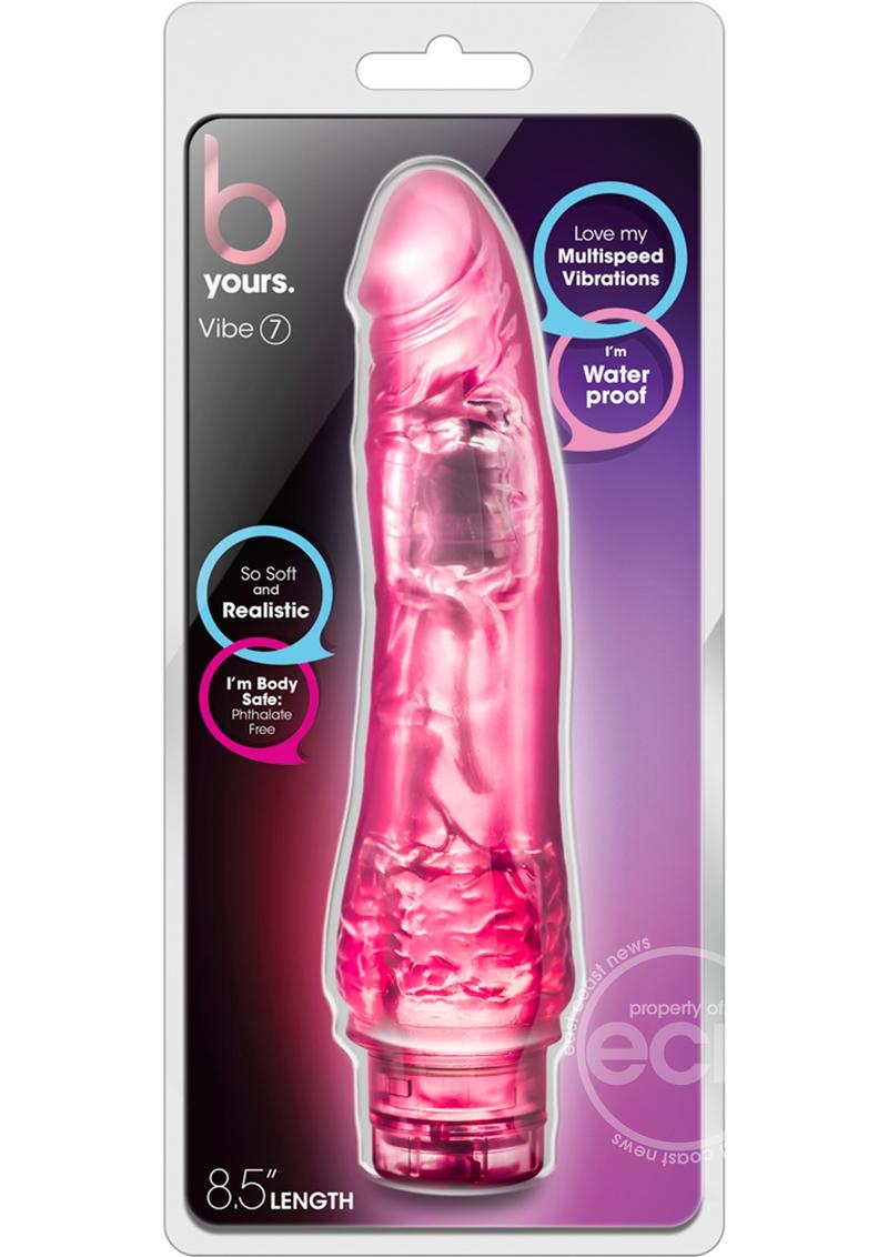 Blush Novelties B Yours Vibe #7 is a soft realistic vibrator measuring 8.5 inches with a tapered shaft. The twist dial base is waterproof for shower and bath time. Created for the beginner and for the cost conscious, Vibe #7 is made of phthalate free PVC. To clean use soap and water or a toy cleaner then let air dry.