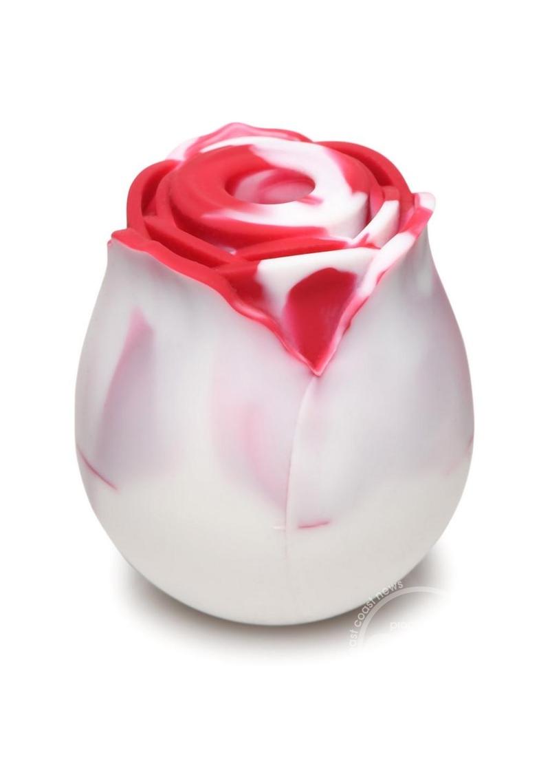 Give your lover a gift that shows class, style and thoughtfulness! This sucking rose clit stimulator is surrounded by roses and placed in the center of a heart-shaped box! Carefully curated to let your partner know that you love them so much… you want them to have lots of orgasms! The powerful rose nestled in this bouquet offers 3 intensity levels and 7 patterns. With air-stim technology that gently sucks at the clit, this kind of stimulation will send them over the edge of ecstasy! Made out of silky smooth silicone, it is also phthalate-free and body-safe. Use only with water-based lubricants! Want to get even wetter? Take this waterproof toy into the shower or bring it into the bathtub! It can be submerged under water for up to 30 minutes without issue. To clean, use warm water and mild soap, then spray with a toy cleaner and wipe dry. Recharge using the magnetic charging base and let your rose perch in place like a posed decoration!
