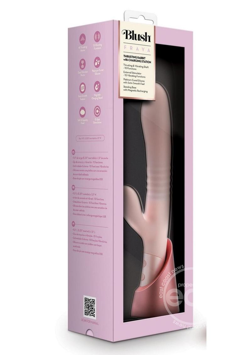 Introducing Fraya Thrusting Rabbit Vibrator, your new companion that will elevate your pleasure. Two independently controlled motors feature 10 vibrating modes for clitoral and G-spot massage, leading to intense orgasms! Fraya thrusts and vibrates without pinching or pulling. Its squishy head creates a satisfying experience. Made from platinum-cured silicone with a satin smooth feel, which is safe, non-porous, easy to clean, and free from body harming chemicals. Includes a standing base with magnetic recharging so you never have to worry about cords again. Treat yourself and unlock a world of sensations that will make you blush.