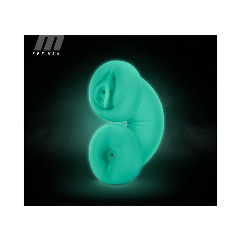 The M for Men Double Trouble Delight Glow stroker is loaded with fun! This pocket stroker is self-lubricating, just add a little water or saliva and everything gets slippery. Plus it glows in the dark - easy to see at night, alone or with a partner! The Double Trouble Delight has 2 ends to penetrate, with an easy-to-hold design. Super-soft and flexible, this stroker will fit any size shaft. Made of body safe TPE; free of phthalates, paraffins, and latex.!