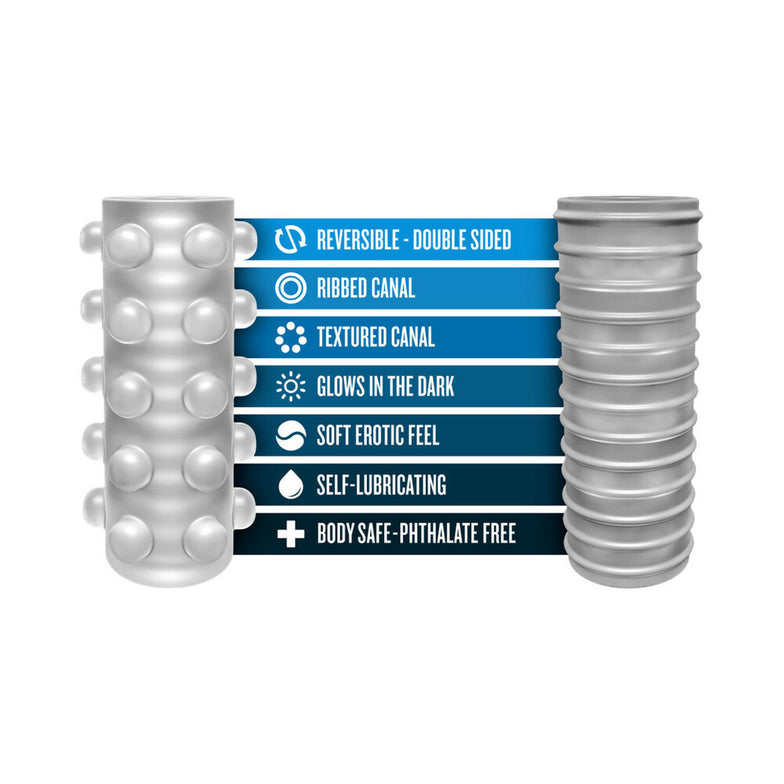 The M for Men Reversible Orb is loaded with fun! This pocket stroker is self lubricating. Add a little water or saliva, and everything gets slippery. Plus it glows in the dark - easy to see at night, alone or with a partner! The Reversible Orb is double-sided and reversible: choose between ribs for sensational stroking, or pressure point massage. Super-soft and flexible, the Reversible Orb will fit most shaft sizes. Made of body safe TPE; free of phthalates, fragrances, paraffins, and latex.