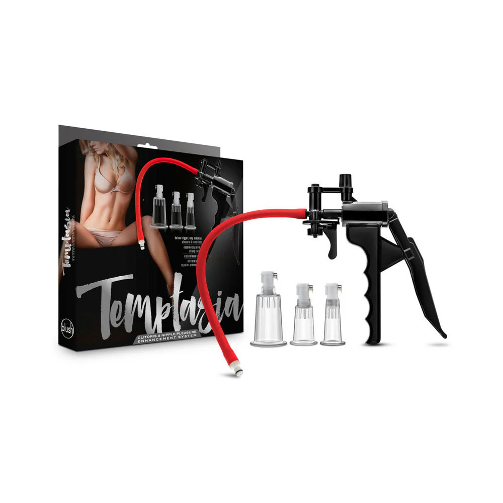 Love clit pumping and ready to take it to the next level of pleasure? Temptasia - Clitoris Pleasure and Enhancement System is high-grade for serious clitoris pumping. Used to increase sensation to your clitoris and nipples thereby enhancing pleasure. Place cylinder over your desired erogenous zone. Use trigger to create the desired suction. Featuring an air release valve for easy removal. You can maintain constant suction or practice pumping, releasing and pumping again to simulate oral sex. Air pressure gauge measures how much you are pumping your clit. The cylinder can be detached leaving your clitoris or nipple suctioned to the cylinder. Includes 3 cylinders of various sizes each offering a unique sensation and different levels of enjoyment. Enjoy the enhanced pleasure and the unique sensations of clit pumping and the thrill of nipple pumping.
