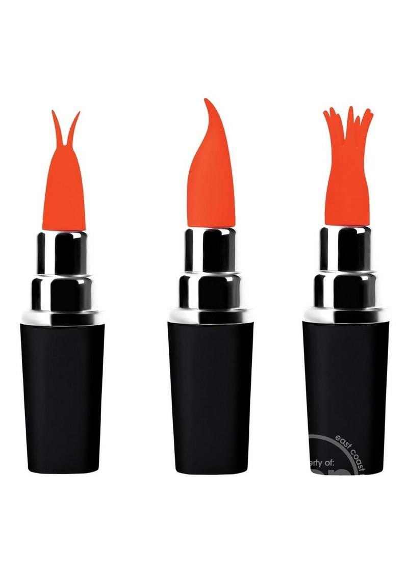 The ultra-discreet Bodywand Date Night Kiss Kiss Lipstick Vibe is designed to look just like your common lipstick, but is enhanced with powerful vibrating stimulation. The slant tip features a center nub for direct stimulation, plus it comes with three additional tips to explore different satisfying sensations.