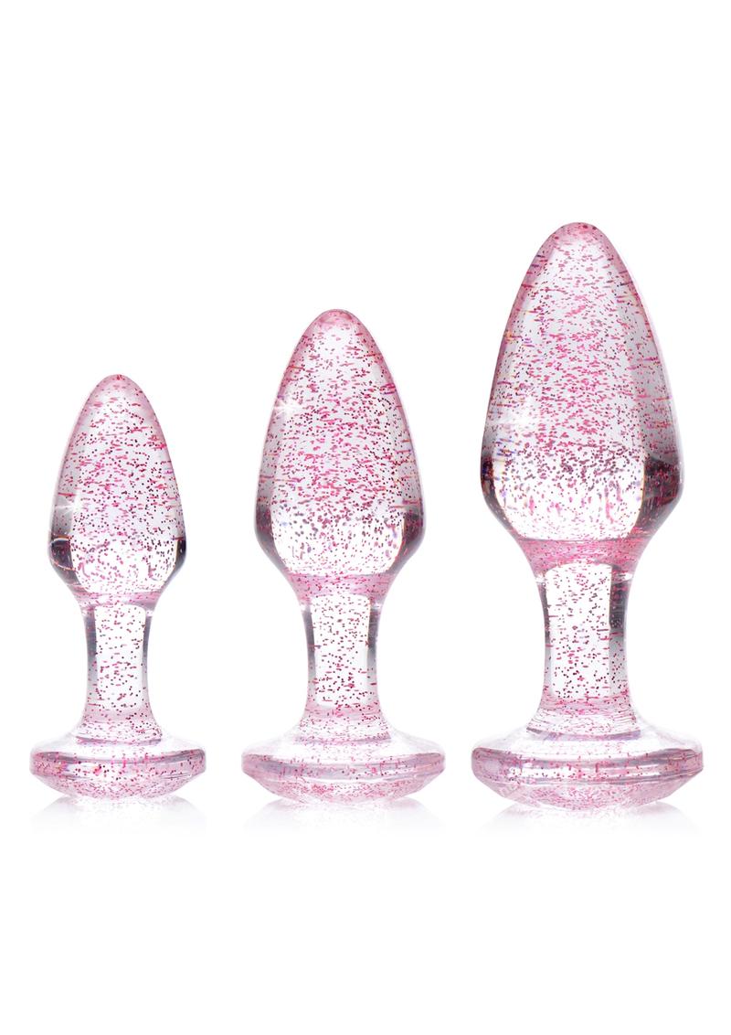 This set of smooth, solid, butt plugs feature a shiny glittery pink pattern to decorate your booty while you play! These Glitter Gem plugs are tapered and slim, and graduate in size from small to large for easy training - perfect for beginners and experts alike!