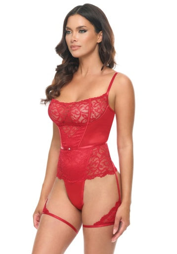 SOFT CUP STRETCH SATIN AND LACE BONED TEDDY WITH ATTACHED GARTERSTAYS