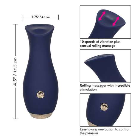 The Chic Tulip Massager is the definition of sophisticated pleasure. A unique rolling massage top offers incredible stimulation while 10 speeds have synchronized constant vibration. The superior silky silicone and decorative accents show off your desire for detail as much as your desire for enjoyment. To keep the pleasure right where you want it, this massager has a feature that will save your last favorite function used.