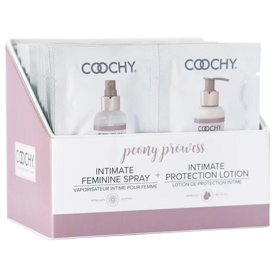 Duo Foil pack of intimate feminine spray + intimate protection lotion. Peony Prowess. Display of 24 duo foils.