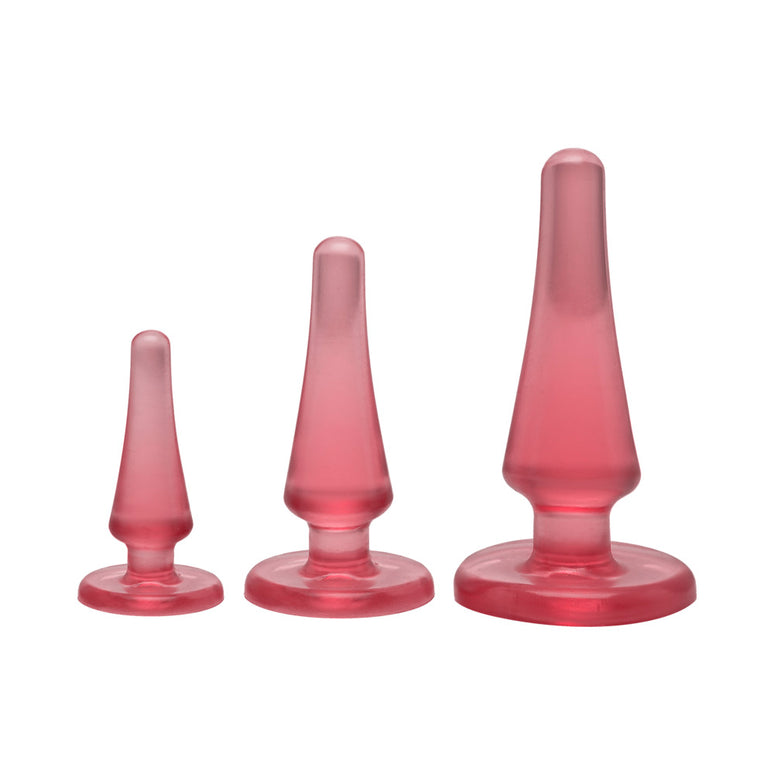 Kit allows beginners to ease into backdoor play while enjoying each stage of intensity and fullness. Three classic plugs in smooth, body-safe PVC sized at one-inch intervals offer progressive levels of sensation, while flared bases and a firm yet flexible feel ensure safe and versatile fun. Experienced backdoor enthusiasts can also enjoy this set as the warmup for a night of more intense exploration. Three insertable lengths/widths: 3 in./0.8 in.; 4 in./1.1 in.; 5 in./1.5 in.