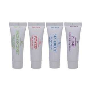Keep the good times going with this pack of creams designed to keep you harder for longer. Included are four options. Plump is an enhancing gel that helps increase blood flow to the penis, which makes for a thicker, larger look and feel. Sta-Erect is a delay cream formulated with pheromone to boost sexual desire. Power+ delay cream is formulated with yohimbe, which provides increased circulation and blood flow. The Prolonging delay cream includes ginseng, a traditional aphrodisiac. All three delay creams will decrease penis sensitivity for extended play.