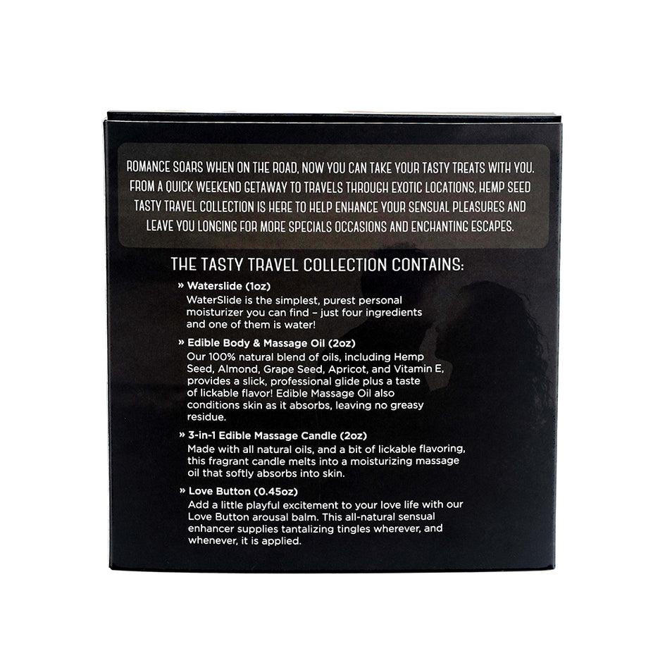 Romance soars when on the road, so now you can take your tasty treats with you. From a quick weekend getaway to travels through exotic locations, Hemp Seed Tasty Travel Collection is here to help enhance your sensual pleasures and leave you longing for more specials occasions and enchanting escapes. Contains: 1 oz Waterslide moisturizer, 2 oz Edible Massage Oil, 2 oz Edible Massage Candle, and Love Button arousal balm. Watermelon scent.