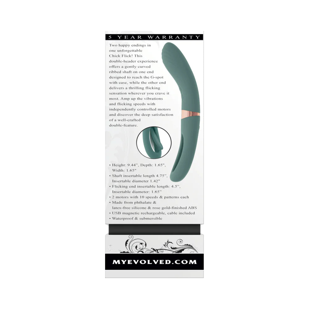 Two happy endings in one unforgettable Chick Flick! This double-header experience offers a gently curved ribbed shaft on one end designed to reach the G-spot with ease, while the other end delivers a thrilling flicking sensation wherever you crave it most. Amp up the vibrations and flicking speeds with independently controlled motors and discover the deep satisfaction of a well-crafted double-feature.