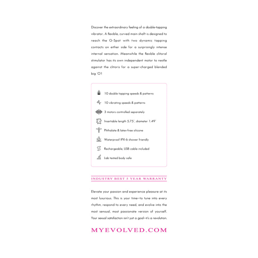 Discover the extraordinary feeling of a double-tapping vibrator. A flexible, curved main shaft is designed to reach the G-spot with two dynamic tapping contacts on either side for a surprisingly intense internal sensation. Meanwhile the flexible clitoral stimulator has its own independent motor to nestle against the clitoris for a super-charged blended big 'O'!