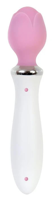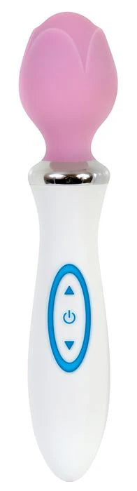 Features: powerful wand vibrator. Intense clitoral stimulation. Made with luxurious silicone. 5 powerful speeds and 7 functions. Rechargeable. USB cable included. Elegant LED flower shaped tip. Control base with LED lights.