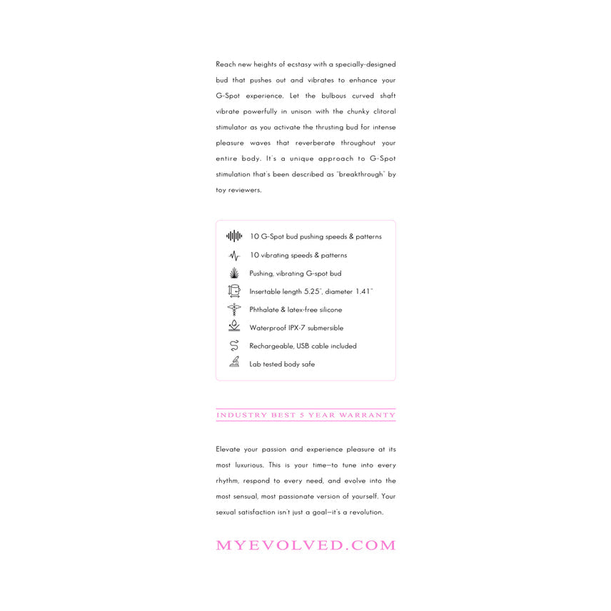 Reach new heights of ecstasy with a specially-designed bud that pushes out and vibrates to enhance your G-Spot experience. Let the bulbous curved shaft vibrate powerfully in unison with the chunky clitoral stimulator as you activate the thrusting bud for intense pleasure waves that reverberate throughout your entire body. It's a unique approach to G-Spot stimulation that's been described as "breakthrough" by toy reviewers.
