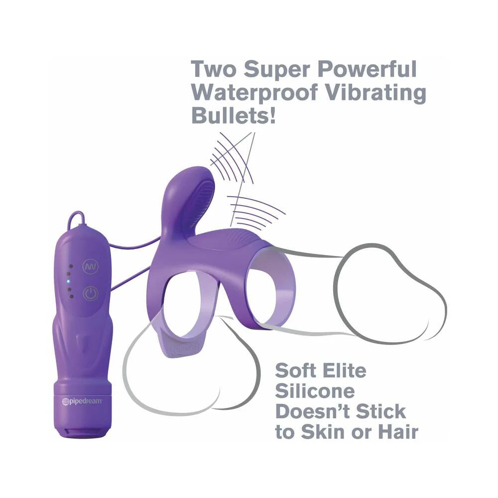 A pleasure ring that delivers incredible clitoral stimulation and internal vibrations at the same time. With a pair of powerful vibrating bullets placed inside and on top of the super-soft silicone cock cage, this vibrating erection enhancer turns ordinary sex into marathon sessions. Hell love the tight squeeze, extra buzz, and rock hard erections, while she enjoys the wall-banging climaxes delivered by the powerful clitoral vibrations. Choose between five speeds.