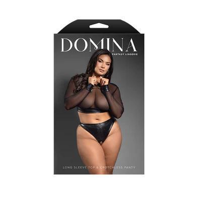 Fantasy Lingerie Domina Embossed Faux Leather Mesh Long Sleeve Top & Crotchless Thong