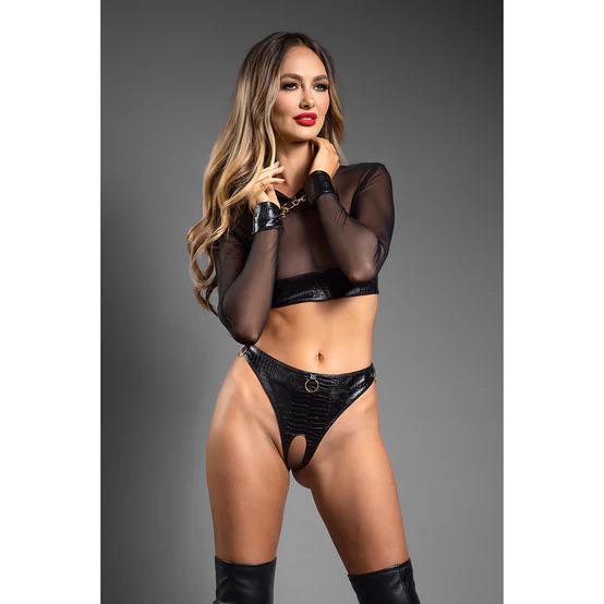 Embossed Faux Leather and Sheer Mesh Long Sleeve Top with Clasp Hardware on Cuffs and Crotchless Thong Panty with O-ring Accents for Restraint Play; Gold Hardware