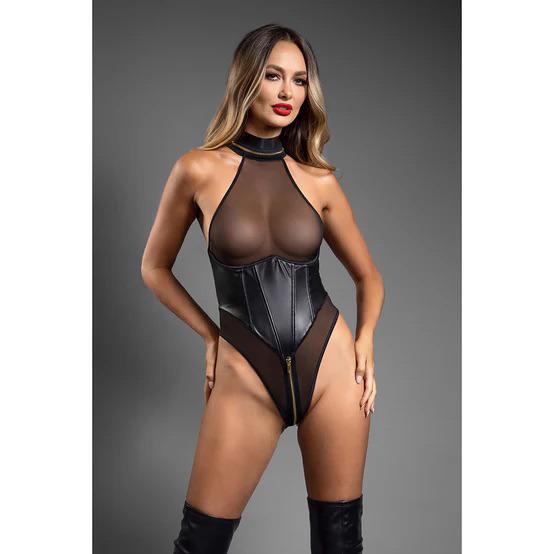 Sheer Mesh Teddy with Zipper Halter, Faux Leather Corset Bodice and Front to Back Zipper Bottom; Gold Hardware