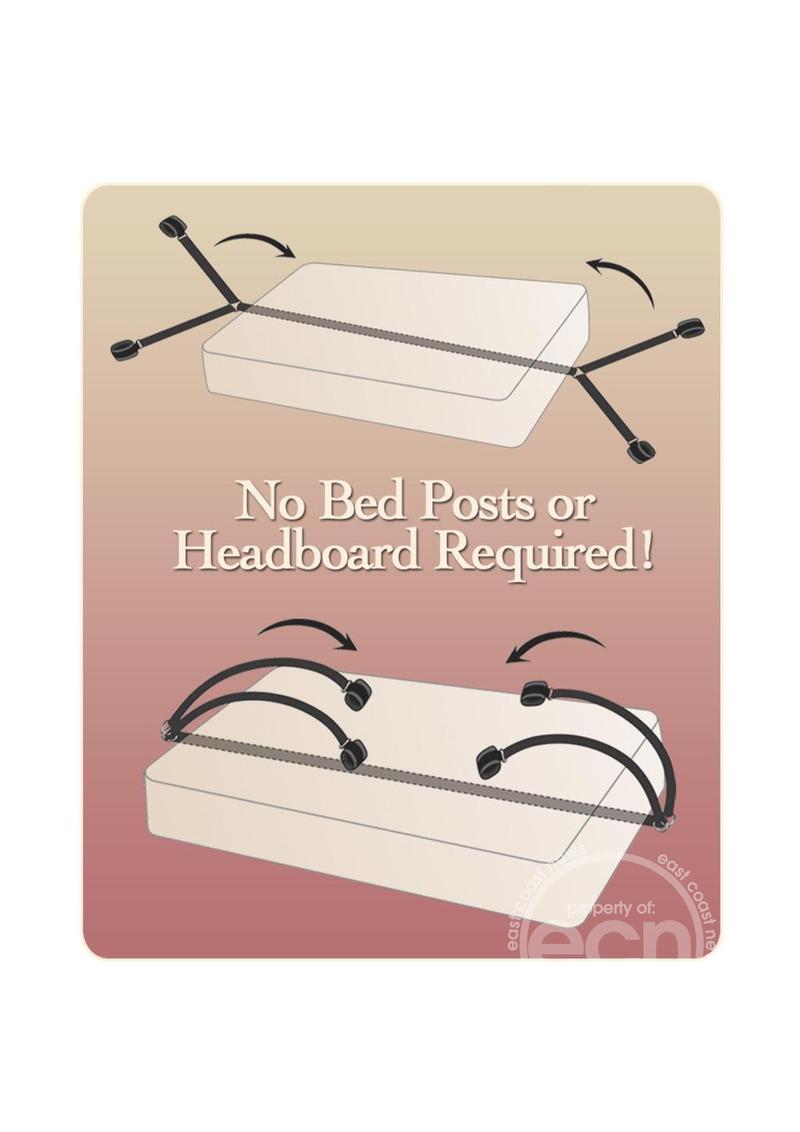 Transform your bed into a passion playground with these under-the-mattress bed bindings. Experience the thrill of bondage and role play. This kit contains: 4 Nylon tethers, 2 Velvet hand cuffs, and 2 Velvet leg cuffs. Explore your deepest fetish fantasies!