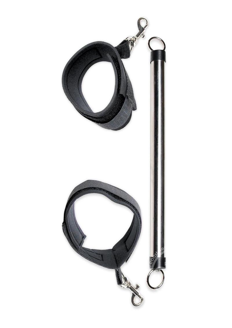Open wide! This beginner's metal Spreader Bar will put you or your partner in the right position for pleasure every time. Attach the adjustable ankle cuffs and your subject won't be able to close their thighs. Try new positions and scenarios you never dared, and do it all with easy access. They'll squirm around and squeal, but they won't get out!The detachable cuffs have a comfortable soft-neoprene inner lining thats easy on the ankles.