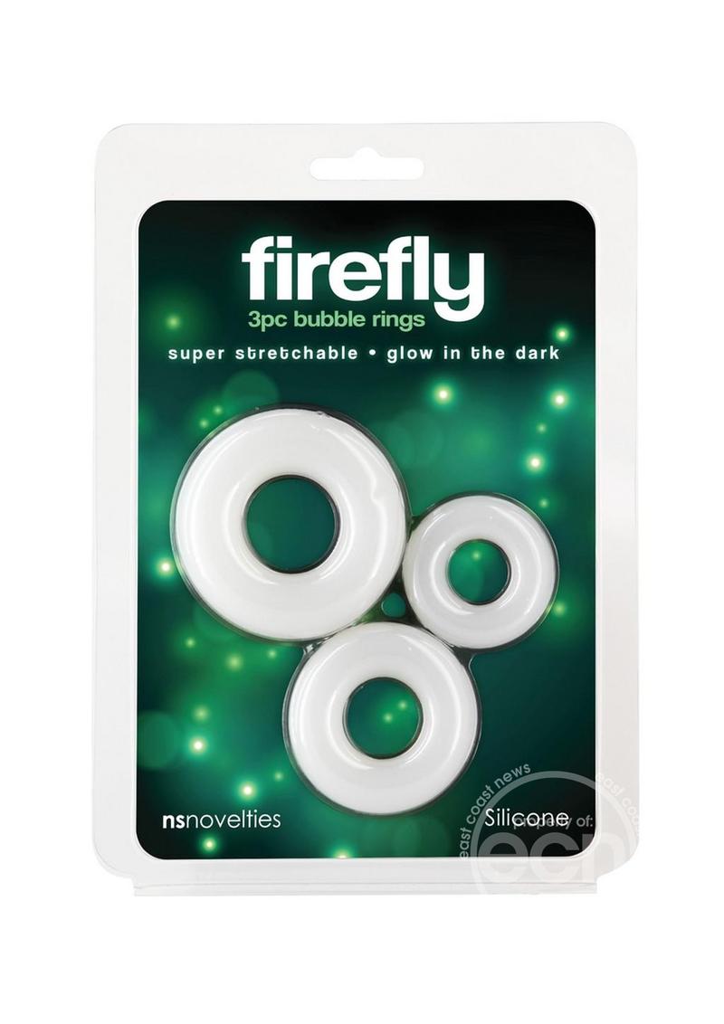 Firefly Bubble Rings are glow-in-the-dark cock rings made from exceptionally soft liquid silicone for a comfortable fit. Bubble rings ensure prolonged performance and heighten climax. Available in assorted sizes. Glows white in the dark. Suitable for use with all lubricants including silicone. Waterproof Rating