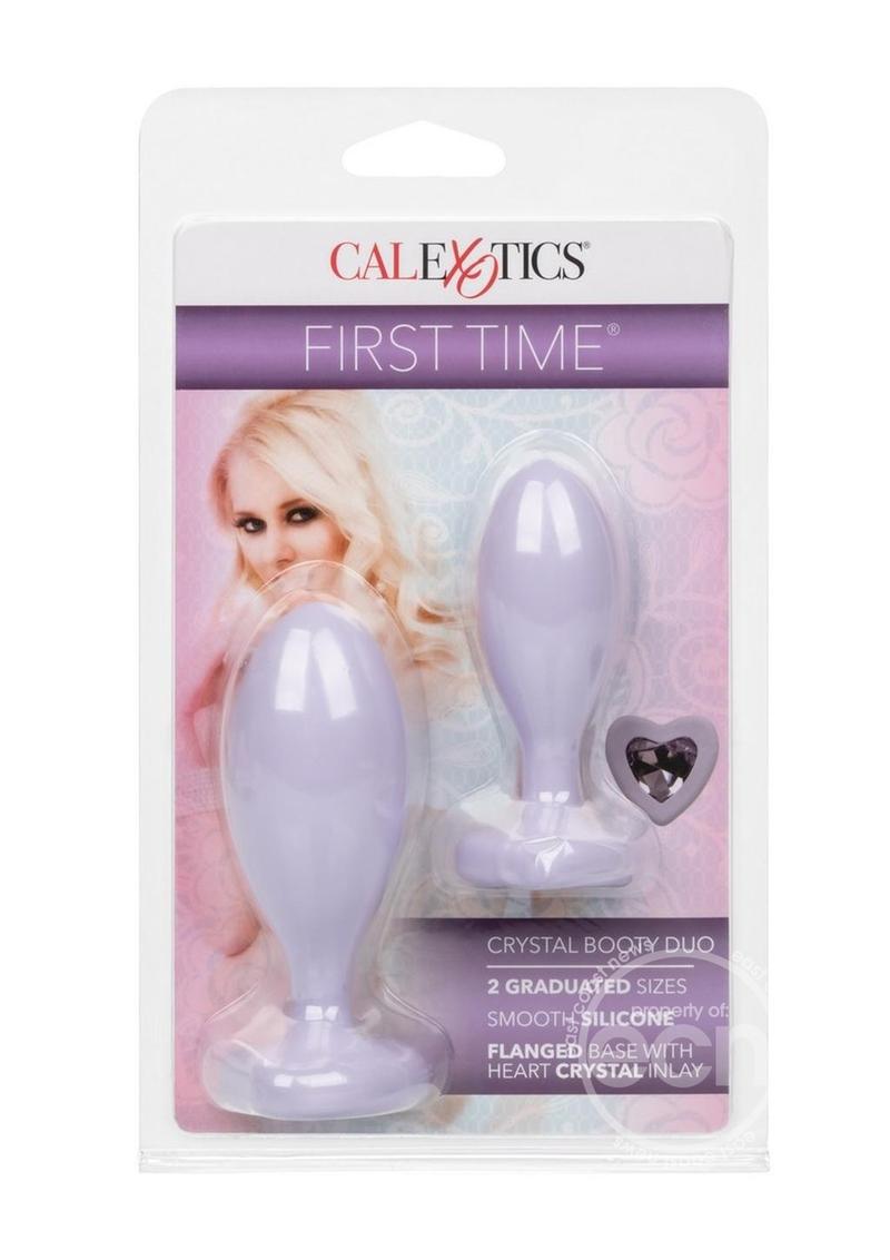 Indulge your naughtiest fantasies and open yourself up to thrilling backdoor play with the First Time® Crystal Booty Duo. This play-ready kit includes 2 graduated anal plugs with dazzling heart crystal inlay base, curvaceous probe design, and plush silicone body.