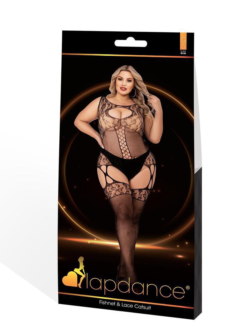 The Lapdance Lingerie fishnet and lace catsuit is an irresistibly sultry one-piece crafted from a sleek blend of nylon and spandex for a flawless, curve-hugging fit. This black catsuit features a mesmerizing mix of varying fishnet and lace patterns, combining elegance with edginess. A daring circular opening at the top adds an extra touch of allure, drawing attention to the neckline. Almost fully see-through, this design embraces bold sensuality, making it perfect for creating an unforgettable impression.
