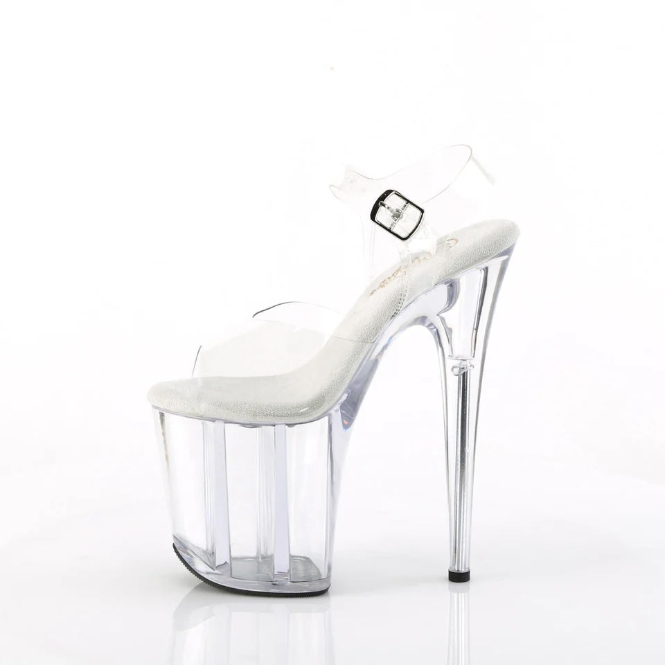 Be ready to turn heads with the Flamingo-808 ankle strap sandal - a dazzling combination of style and height. With an 8-inch stiletto heel and 4-inch platform, these shoes offer a bold and confident stride. The clear front strap and ankle strap create a minimalistic, sexy look, while the attractive color options add a playful touch to your attire. Make a statement with the Flamingo-808.