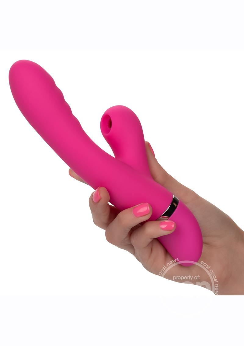 Perfectly sized dual stimulator with sensual suction and incredibly textured shaft. 12 functions of vibration, pulsation and escalation. 4 speeds of intimate suction. Independently operated dual motors. Body-safe Silicone. State-of-the-art memory chip resumes on last function used. Flexes and moves with you. Easy push-button control with LED light and instant on. Security travel lock feature – hold for 3 seconds to turn off.