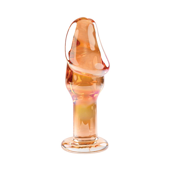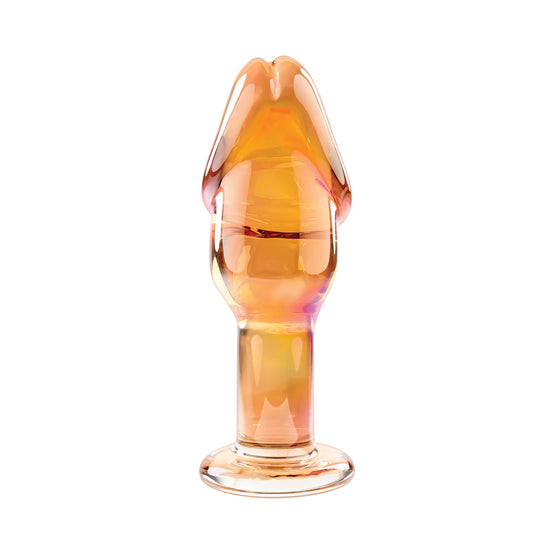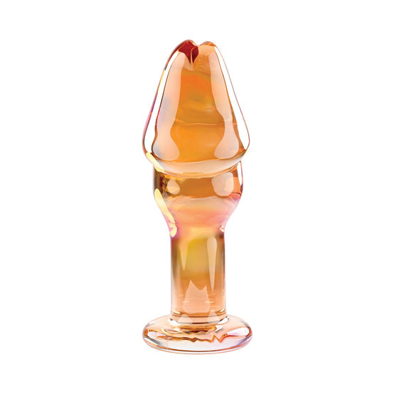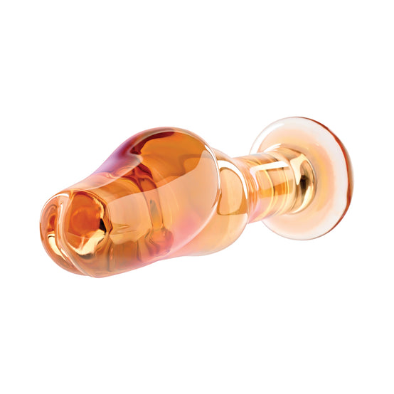 This sparkling glass treasure glows iridescent with gold, red and orange coloring, catching the light from every angle of its tapered-tip crowned head, slim shaft and wide safety base. Experience how impossibly slick and slippery body-safe glass feels, especially with your favorite lubricant, and try temperature play by immersing the plug in cool or warm water for a delicious sensation! Nonporous and extremely hygienic. Tapered crown glass plug