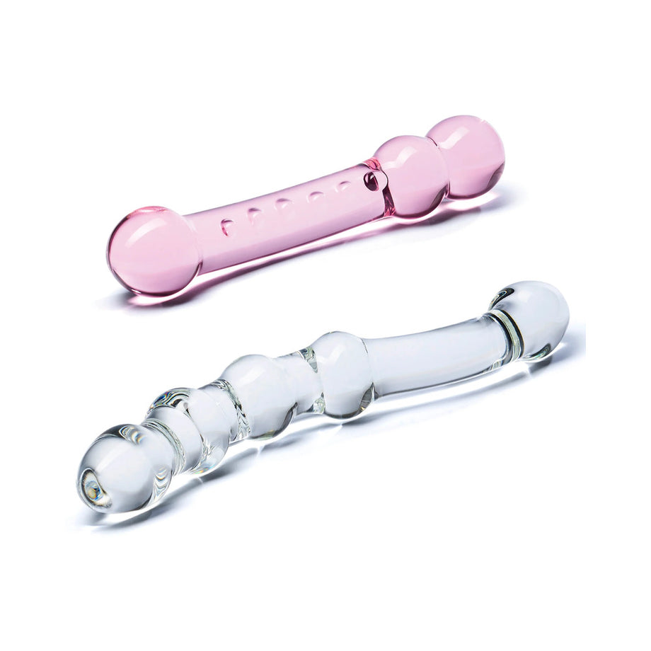 This must-have set of two gorgeous glass dildos delivers the unique, sleek sensation of glass with unique shapes that enhance the pleasure even further. Both dildos are double-ended to offer limitless options for sensual play.