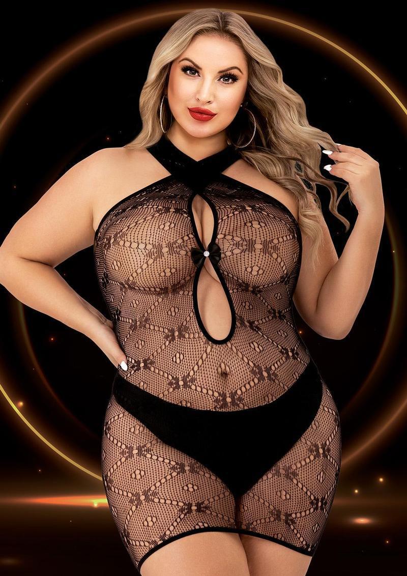 The halter top mini dress from Lapdance Lingerie is designed to captivate and allure with its bold, seductive style. This figure-hugging black mini dress features daring see-through cutouts strategically placed to tease while accentuating your curves. The halter neckline adds a touch of sophistication, highlighting the shoulders and décolletage, while the sleek, black fabric creates a striking contrast with the sheer panels. Perfect for adding a bit of playful edge to your intimate wardrobe, this dress effortlessly blends elegance with provocative charm.