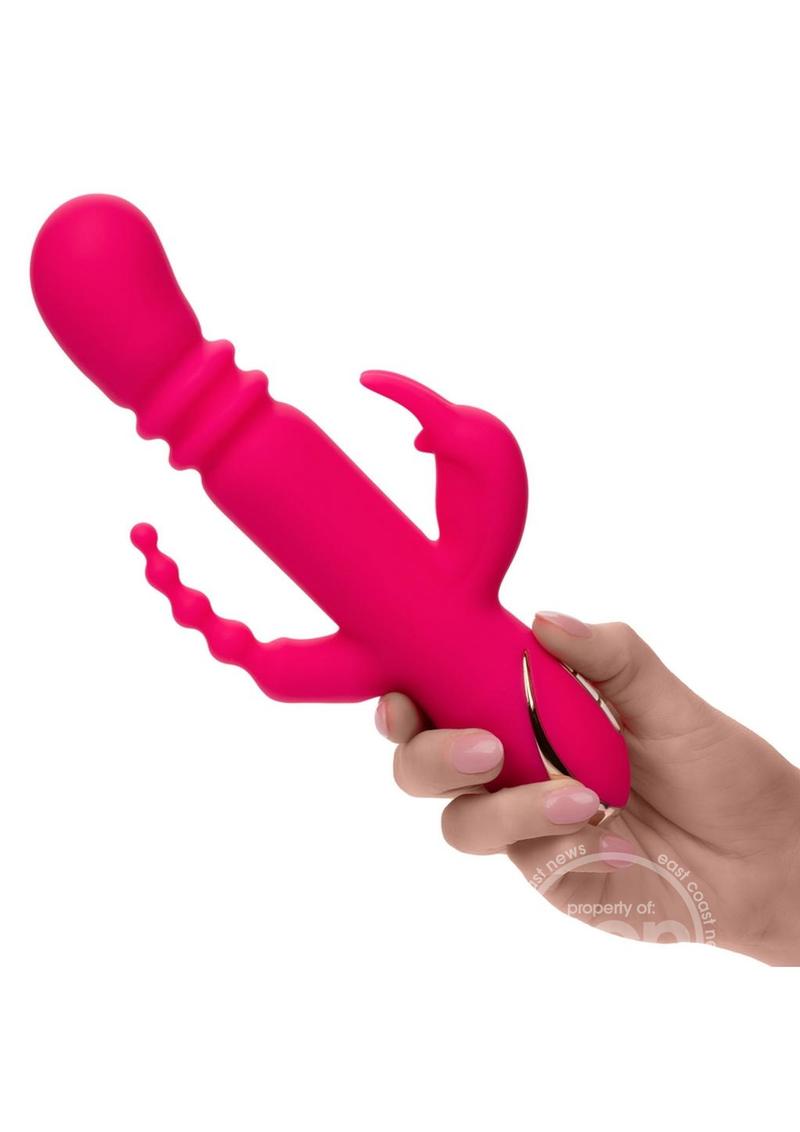 Constructed from body-safe Silicone and 100% waterproof with an IPX7 rating, the Triple Fantasy Rabbit is designed for versatility. Easy push-button controls are enhanced with a security travel lock feature and LED lights, ensuring ease of use and discretion. USB rechargeable for your convenience, this toy offers a full charge in just 2.5 hours. Once fully powered, enjoy 45 minutes of high-speed pleasure or extend your play with 60 minutes on a lower speed. This is not just any toy; the Jack Rabbit® Signature Heated Silicone Triple Fantasy Rabbit is a milestone, celebrating 30 years of innovative achievements, honoring the Jack Rabbit® tradition, and paving the way for the next era of pleasure tech.