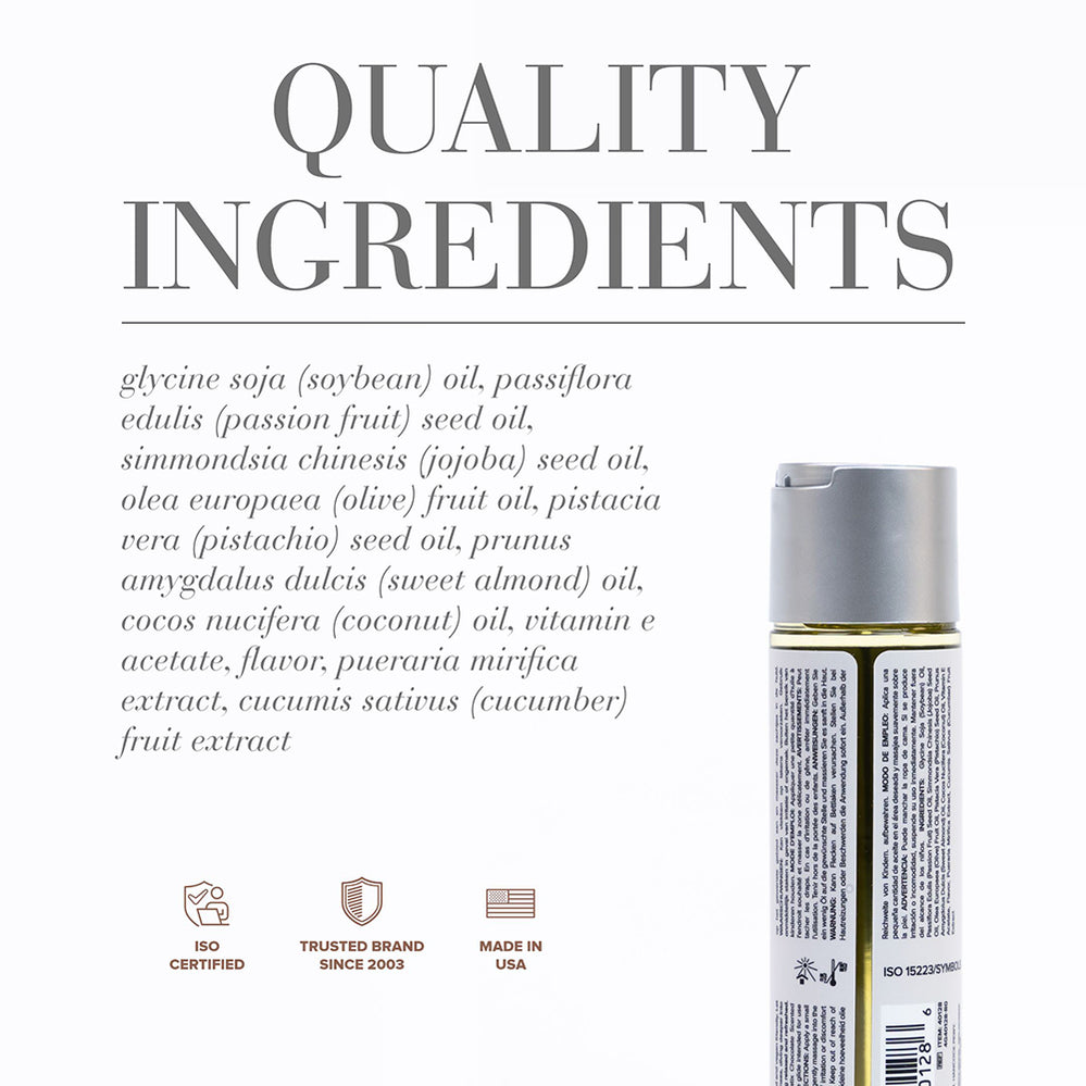 Ingredients: Carthamus Tinctorius (Safflower) Seed Oil, Passiflora Edulis (Passion Fruit) Seed Oil, Pistacia Vera (Pistachio) Seed Oil, Olea Europaea (Olive) Fruit Oil, Pueraria Mirifica Exteact, Cucumis Sativus (Cucumber) Fruit, Cocos Nucifera (Coconut) Oil, Simmondsia Chinesis (Jojoba) Seed Oil, Prunus Amygdolus Dulcis (Sweet Almond) Oil, Vitamin E Acetate, Flavor
