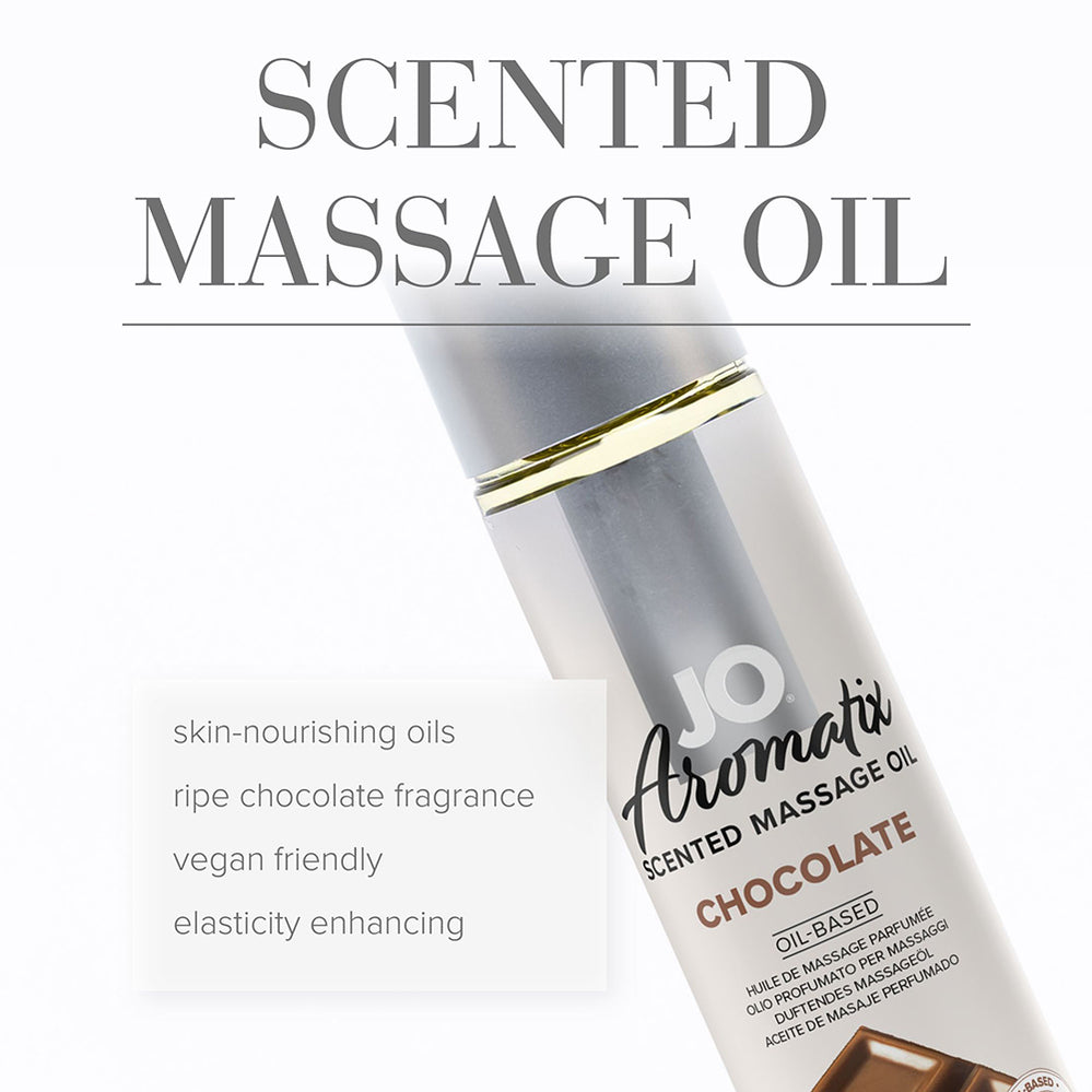 JO Aromatix Chocolate Massage Oilft.s unique blend of ingredients can transform any intimate moment into a captivatingly sensual experience. Featuring a combination of skin-nourishing oils and alluring fragrance of rich, warm chocolate, Aromatix enhances every touch with a rich, moisturizing glide thatft.s always pleasing - but never greasy. All Aromatix formulas are kissable, elasticity enhancing, and vegan friendly.