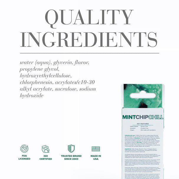 A cool breath of mint tingles atop the warm undertones of rich chocolate in this kissable water-based arousal gel that blends two classic flavors for extraordinarily aromatic clitoral stimulation. Let the tastes melt together on your most sensitive erogenous zone for a truly erotic experience. Key Features: WATER-BASED KISSABLE MADE WITHOUT PARABENS Ingredients: Water (Aqua), Glycerin, Flavor, Propylene Glycol, Hydroxyethylcellulose, Capsicum Frutescens Fruit Extract, Chlorphenesin, PEG-60 Hydrogenated Castor Oil, Acrylates/C10-30 Alkyl Acrylate, Sucralose, Sodium Hydroxide