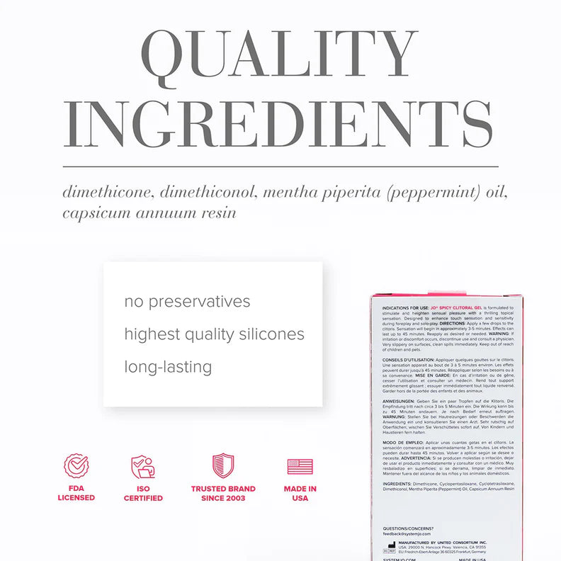 JO Spicy is a topical clitoral stimulant that transforms every soft caress from a mild tingle to an intense, cooling tingle. Its creamy, water-based, formula includes nourishing coconut oil and shea butter, for long lasting play up to 45 minutes. Perfect for both solo and partnered exploration, it pairs especially well with vibrating toys and oral pleasure.