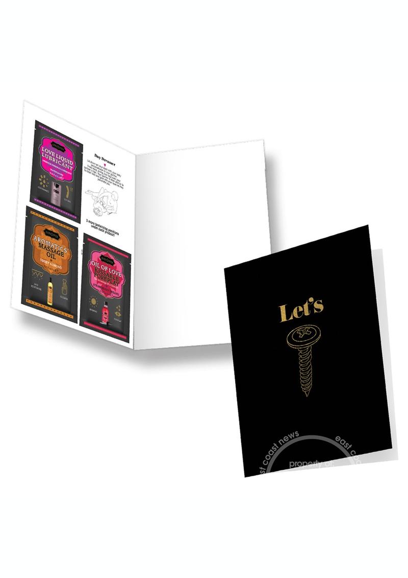 Kama Sutra Naughty notes. Outside of card - "Let's Screw" Inside of card - Blank. Includes 3 tempting products to inspire desire. Each card features a flirty message, 4 Kama Sutra Positions and 3 Romance Product Packets. Contents: Almond Aromatics (3 ml packet) Massage oil, OIL OF LOVE Strawberry (3 ml packet): Kissable, warming foreplay oil, LOVE LIQUID Classic (3 ml packet): Personal, water-based lubricant, 4 Kama Sutra Positions with tips & tricks. Envelope: *Not suitable for standard mailing. Must be hand cancelled. Requires extra postage.