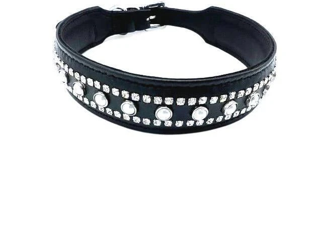 LEATHER KITTY COLLAR WITH RHINESTONES & WHITE PEARLS