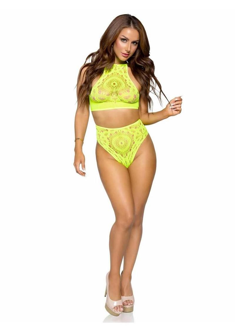 2 PC Crochet Lace Halter Crop Top with Strappy Back Detail and High Waist Thong Panties
