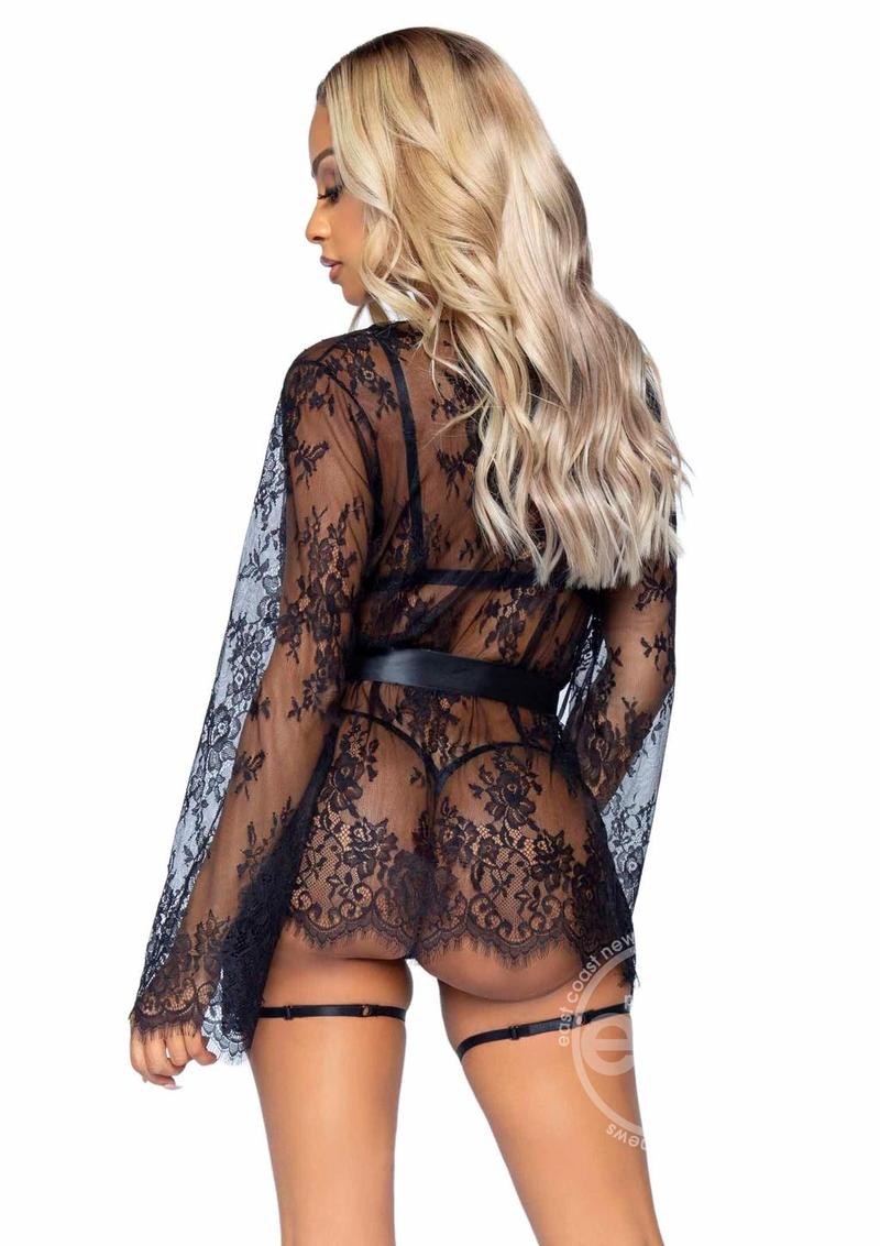 3 PC Eyelash lace garter teddy with g-string back and adjustable straps, lace robe, and ribbon tie.