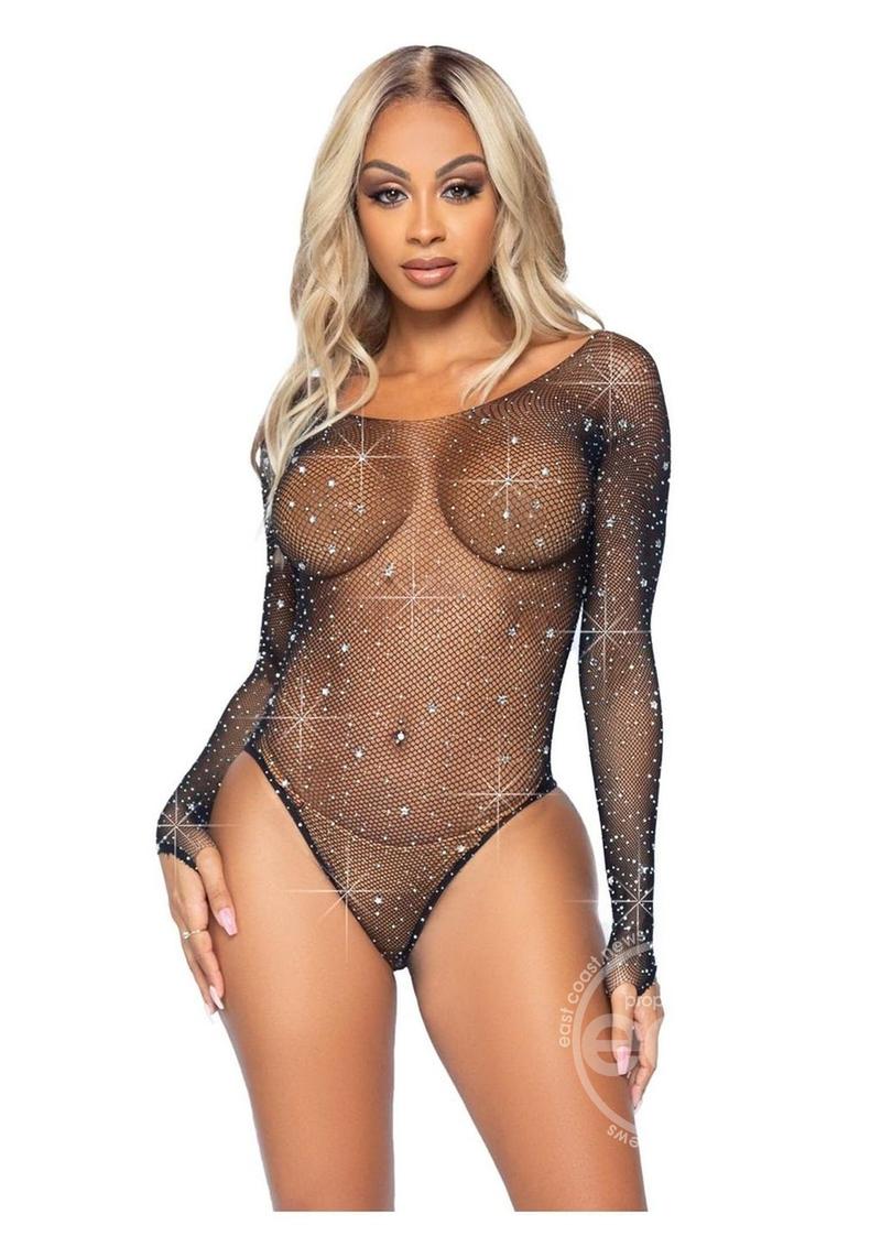 Galaxy star rhinestone fishnet bodysuit with snap crotch O/S Black